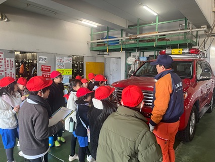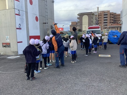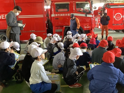 1月20日(火)3年生が社会の学習で津市消防本部・久居消防署へ見学に行きました。いろいろな消防車の種類があること、消防署の施設の中のようす、訓練棟、通信指令室など、緊急な対応ができるような工夫もたくさん教えていただきました。また、見学しているときに、救急車が出動することになり、その様子も見ることができました。私たちのくらしを守る消防署についてしっかりと学習ができました。