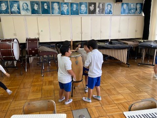中をのぞくと、2年生がいろいろな打楽器をつかっているところでした。
