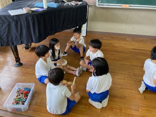 ボンゴ、カスタネット、トライアングル、ウッドブロックなど、初めてふれる楽器もあり、たたき方を考えたり、たたく場所を変えてみたりしながら、子どもたちは生き生きと楽器に親しんでいました。