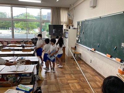 なるほど、算数「長さ」の学習ですね。教室の奥行や黒板の幅など、いろいろな長さを自分たちで計測しているところでした。先生の身長もはかったそうです!