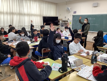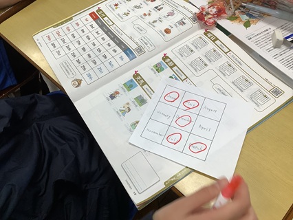 12月12日(金)6年生が英語ビンゴをしていました。1月から12月までを英語でビンゴのマスに書き、先生が引いたくじの出席番号の子が「〇月」と英語で言っていきます。もちろん、出席番号も英語です。「ビンゴ!」「あっ、ダブルビンゴ!」「トリプルや!」と盛り上がっていました。楽しい英語の時間でした。