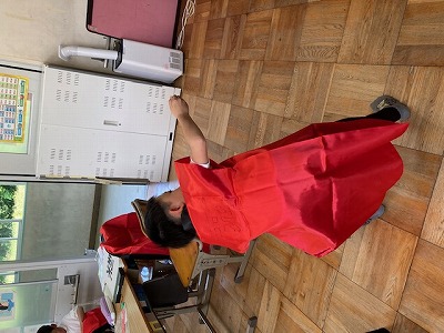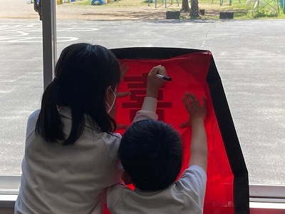 3年生教室では“はっぴ”の背中の部分に大きく文字を書いていました。