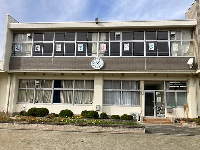 音楽室の窓に、運動場からよく見えるように「え」「が」「お」「で」「あ」「い」「さ」「つ」と全校のみんなへの呼びかけを貼ってくれました。