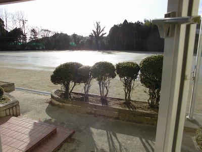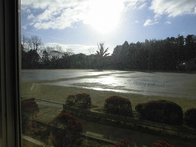 1月30日の土曜日、用事があって学校へ出てきました。早朝、誰もいない運動場は寒さで凍てついていました。太陽が反射して、幻想的な雰囲気でした。