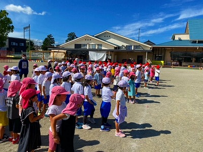 一志こども園出身の子も初めて行く子も、みんなワクワクしながら交通ルールを守ってこども園に行きました。こども園に着くとたくさんの子どもたちや、先生がお出迎えをしてくれました。自由遊びの時間はみんなでリレーや砂場遊び、遊具などを使って遊んでいました。