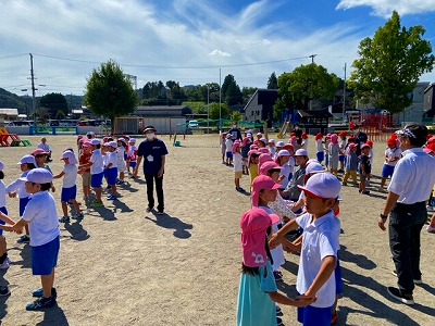 ふれあい遊びでは、二人一組になってダンスを踊って楽しみました。子どもたちからは、「まだ帰りたくない」「もっといっしょに遊びたい!」とお別れを惜しむ声も聞こえてきました。半年後には新一年生として入学してくる年長さんたちに、一足先にお兄さん、お姉さんの姿を見せることができました。こども園のみんな、一志西小学校で待ってるよ~!