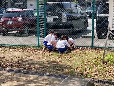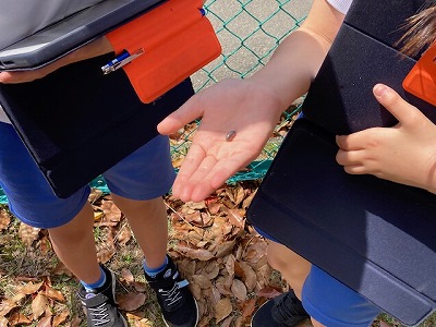 4限目、運動場で4年生がタブレット端末を手に何かを探しているようでした。