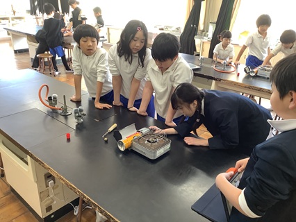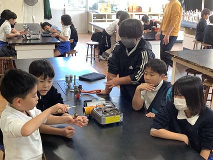 12月9日(火)4年生が理科「もののあたたまり方と体積」の学習で、金属は温度によって体積が変化するのかについて考えていました。予想をたてたり、実験の方法を考えたりして、実験に向かいました。理科のおもしろさを感じてくれたのではないでしょうか。金属球をあたためるため、カセットコンロを使って、火を使います。初めてカセットコンロで火をつけたという子もたくさんいました。安全に気を付けて、実験を進めていました。