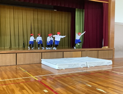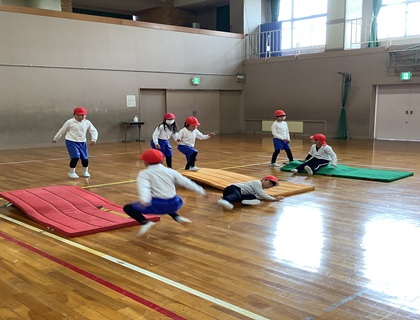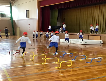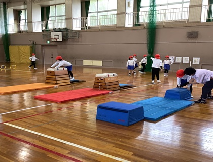 12月15日(月)2年生が体育「とび箱ランド」で運動を楽しんでいました。とび箱、マット、クッション平均台、舞台へかけ上り、マットへジャンプで下りる、ミニハードルと次々とある種目に挑戦です。ジャンプやハードル、マット運動では、自分で動きを考えてやっていました。しっかり運動し、体を動かすことを楽しんでいるようでした。そして、先生の「集合!」の合図で、サッと集まり並んで話を聞く姿もとてもすばらしかったです。