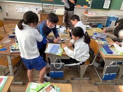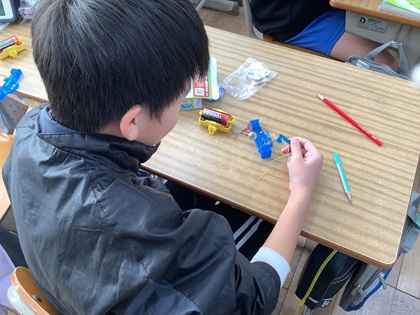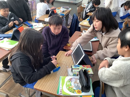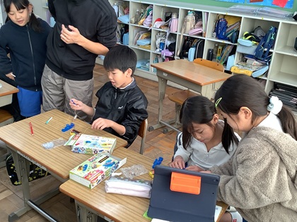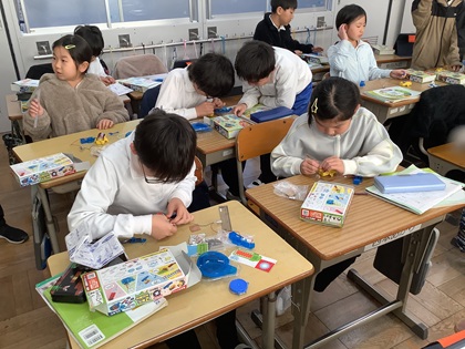 12月16日(火)3年生が理科「電気で明かりをつけよう」の学習で、どう線通しゲームを作ってゲームを楽しんでいました。(ずいぶん前(昔)に、テレビ番組でイライラ棒にチャレンジしていたのを思い出します。)子どもたちは、導線のビニールを剥く作業に苦戦していましたが、得意な子が助けてくれている場面もありました。どう線通しゲームのコースにカーブをつけるなど工夫して、難しいコースを作って、チャレンジしている子もいました。理科で学習をしたことを応用して楽しむことができたようです。