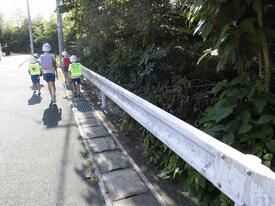 井関方面から団地下の道路を上がってくる通学路。ガードレール沿いの草木が伸びてきて、見通しも悪いし切らなくっちゃいけないなあと思っていた矢先のことです。現場を確認しようと登校時に歩いていくと・・・。