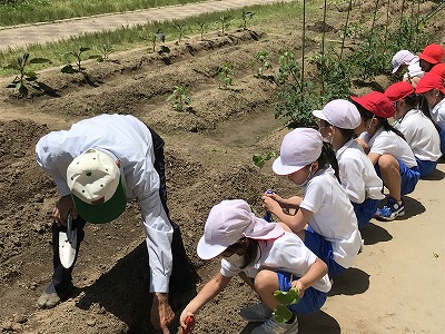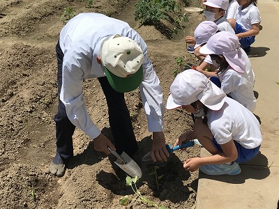 今日はいつも中庭の畑のお世話をしてくださっている農業アドバイザーの地域の方と1年生の子どもが一緒にさつまいもの「つるさし」をしました。