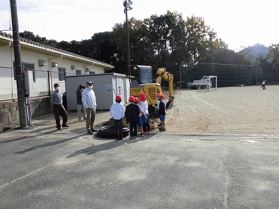 今日、明日と水道の配管工事の関係で、運動場にパワーショベルが入っています。休み時間には工事を中断していただき、子どもたちにも注意するよう伝えるなど、安全第1で臨んでいます。