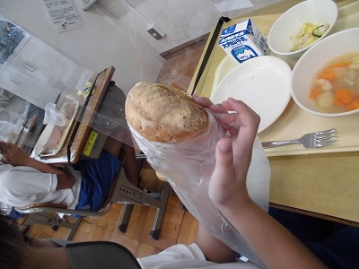今日の給食は、みんな大好き、きな粉揚げパン! 一志中学校区の人気ダントツ1位のメニューです。 1年生教室に届いた、パン、パン、パン! 3・4年生は丸い形です! 手が汚れないように、一人ずつナイロン袋に入れて配膳します。これも給食センターさんの気配りですよね! ありがとう! 子どもたちは、おいしそうにパクついていました。 「おいしい!」と声を出せないのが残念です。 今日の揚げパンもそうですが、黒糖パンに米粉パン、おいしいパンが勢揃いです!給食って、楽しいですよね! |