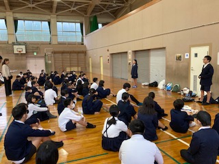 小雨だったため、体育館で出発式を行いました。