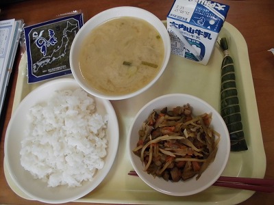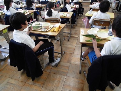 今日の給食は、「子どもの日スペシャル」と勝手に命名しました。①ちまき ②山菜手巻き寿司 ③新玉ねぎのみそ汁 とってもおいしかったです!