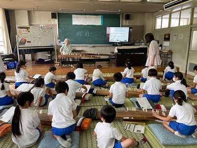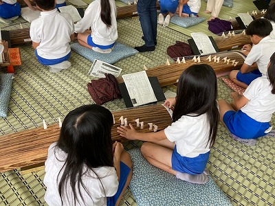 ほとんどの子どもたちは、本物の琴にふれるのが初めてです。緊張した面持ちで弦をはじいていました。心地よく響く琴の音に感動です。