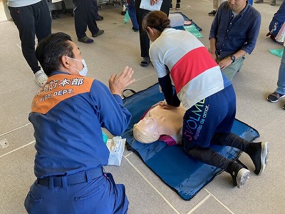 人形を3体持ってきていただき、心臓マッサージやAEDの操作について一人一人実際に練習をさせていただきました。