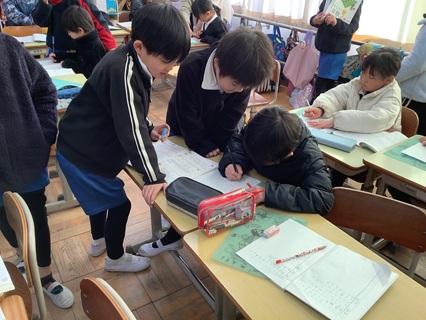 1月21日(水)2年生が算数「1000より大きい数」を学習しています。教科書の練習問題を一人で黙々と解き進める子、隣の子に少し聞いて確認しながら解き進める子、友だちがわかるように丁寧に説明する子、と真剣でいろいろな学びの姿がありました。友だちがわかるように説明することは、難しいことではありますが、説明する本人にとっても理解が促進されています。教えてもらっている子も、納得がいかないところは、聞き返す姿もありました。どの姿もすてきです。