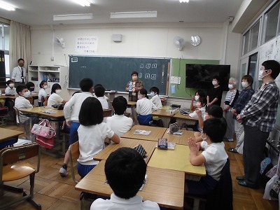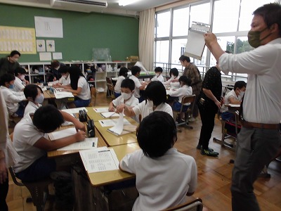 まずは身近にある点字を確認しました。シャンプー、エレベーター、トイレ等、子どもたちの気づきはGOODでした。 点字の説明を受けてから、 さあ実際に鉄筆で打ってみる作業です! 慣れてくると、けっこう早く打つことができるようになってきました。自分のお名前にも挑戦です。打つ人は、読む人が読めるように、逆打ちをするわけです!(点字の6つのドットを裏から逆さまに打って点を浮かび上がらせる、単語もお尻の文字から打たねばなりません) 休憩タイムには、ボランティアの方々が作成された点字絵本を手に取り、感嘆の声をあげていました。 単語カードの作成にもチャレンジしました。準備してもらってあった点字の絵に、ペンでドットに黒を着色します。すると形が浮かび上がってきます。これが細かい作業で、集中力が必要になります。あちこちで、「フーッ」という息が漏れ聞こえていました。このあとは、きれいに着色していました。本当に貴重な体験をさせていただきました。一過性に終わらないよう、学習を深めていきます! |