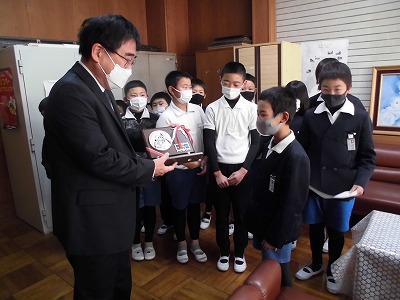 14日(火)お昼休みの時間、スポ少のコンドルズのメンバーが校長室へ約束通りにやってきました。約束通りというのは、ちゃんとアポも取って、礼儀正しく、ミニ表彰式にやってきたのです! 新メンバーで挑んだ大会で準優勝を収めたということで、賞状と盾を見せに来てくれたのです。 賞状です! 代読して渡しました。 盾です! ずっしり重かったです! みんながきびきびと動き、会話もはきはきとしており、気持ちよい式となりました!記念撮影をしました。部員募集の案内板もちゃっかり手にしており、すばらしいことこの上なしです! 今後の活躍も期待大です! |