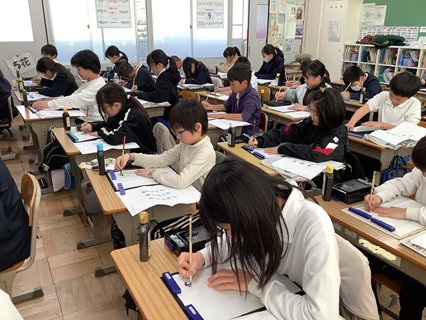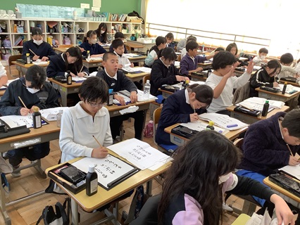 2月16日(月)5年生が書写をがんばっていました。小筆で書く課題に取り組んでいます。漢字やひらがなのバランスに気を付けながら、全集中で取り組んでいました。「雪とけて 村一ぱいの 子どもかな」小林一茶の有名な春の俳句です。半紙最後の1枚に取り組むところで、再度気合いを入れ直し、がんばる姿、すばらしかったです。もうすぐ6年生。これからますます楽しみです。