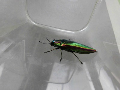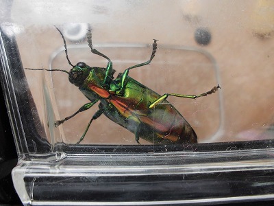 まずは、このまばゆいばかりの輝きをご覧あれ! 3年生の児童が近所の方に頂いたということで、学校へ持ってきてくれました。こちらの腹側から見て、ピンときた方はなかなかの虫博士! この虫は、翠の輝きが魅力となっています。 そうです、玉虫(タマムシ)です。 翠の輝きの中に、赤や青の筋が入り、 輝きに神秘さが加わります。 6年生が修学旅行で行く法隆寺の国宝に「玉虫厨子(たまむしのずし)」という仏教工芸品があり、そこにタマムシの羽が使われていることが知られています。 7世紀の作品ですよ! 子どもたちは、今はやりのゲームのレアアイテムということで知っているようで・・これまた驚きです!。 |