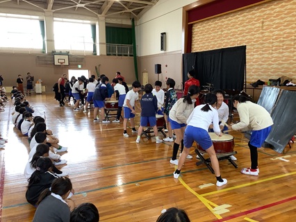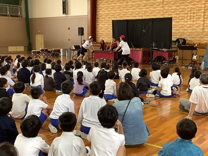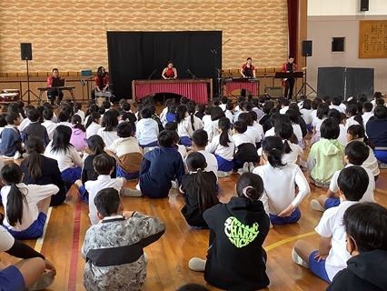 音楽のテーマパーク Ensemble YEAR!!をお招きし、マリンバ演奏を中心にした参加型のコンサートでした。マリンバ奏者の浅岡さんをはじめ、他の奏者の方も津市出身の方ということでした。パワーあふれる楽しいパフォーマンス演奏に子どもたちの笑顔がはじけていました。5,6年生は、和太鼓を一緒に叩かせていただき、全校児童が一体となりリズムを刻んだ場面もありました。まさに音楽のテーマパークでした。