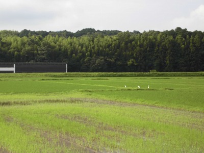 田んぼには、色鮮やかな緑の中に点々と浮かぶようにシラサギやアオサギの姿があります。のどかです。