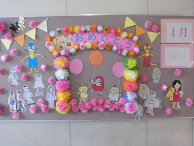 先週、春休みにもかかわらず、ボランティアさんが壁面飾りを更新してくださいました。入学・進級に向けて、華やいでいます! 子どもたちの登校が待ち遠しいです!