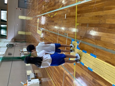 最初はアイマスク体験です。パートナーの肩に手をかけながら、体育館の中を移動することにトライしました。点字ブロックを設置していただいたので、アイマスクをしながらそこも通ってみました。