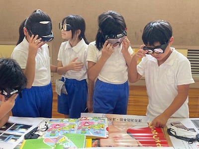 つぎは、いろいろなゴーグルを付けて見ました。色や形がさまざまなのは、白内障の方の見え方、視野が狭くなった方の見え方、色弱の方の見え方などを体験できるようになっているからです。