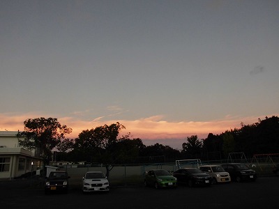 一緒に行動していた事務の先生が「写真に収めました」とプレゼントしてくれました。写真を撮られているなんて、全く気付いていませんでした。 (ちょっと気に入っています!) 学校へ帰ってくると、これまた美しい光景が! 今度は、あかね色です! いろいろとあわただしかった1週間でしたが、 来週も頑張ろうと背中を押してもらった気分です! |