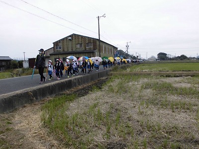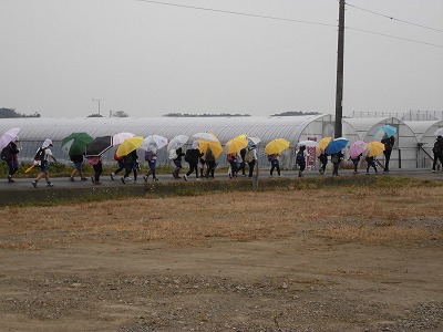 教頭先生を始め、学校に残った面々が心配してくれていた今日の天気・・。先週からずーっと天気予報ばかり見ていて、10/30(金)には「延期もやむなしか、でも月曜の朝まで可能性を信じよう!」と最終判断を延ばした経緯があります。今朝の6時15分。グランドの東の空には、朝焼けが! 「遠足、決行!」「まちcomi.を流しましょう!」 ところが、出発直前から小雨が降り出したではありませんか! でも、ほっと一安心。伊藤牧場さんに到着する頃には、 傘をたたんでノープロブレム! 帰る直前まで、困るような雨にはならず、助かりました! 赤白帽とタオルで、これまたノープロブレム! 日頃の行いと、雨雲レーダーアプリのおかげです! 帰りは、雨。 これくらい、へっちゃら。 でも、往復3㎞くらい歩いて、 枝豆ではしゃいで、疲れたよね。 ※学校では、「雨に濡れて寒いといけないから」と暖房を入れて待ってくれていたのですよ。なんと温かい学校(教室も心遣いも)なんでしょうか! |