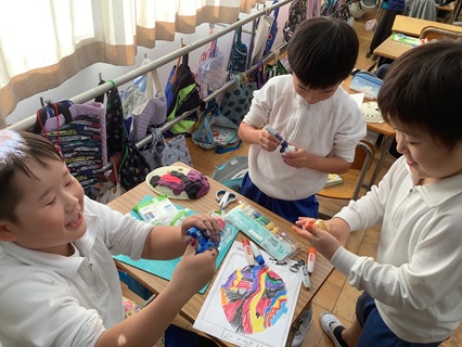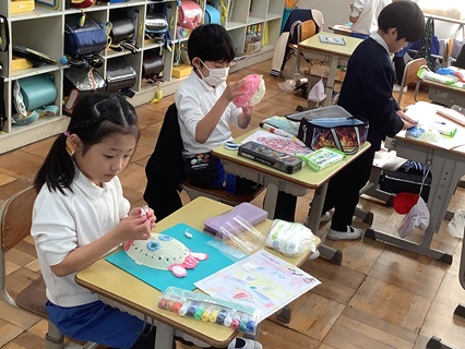 10月30日(木)2年生が図工の時間に紙粘土を使ってお面づくりをしていました。着色するのに、紙粘土に絵の具を混ぜてこねこねこねるのも楽しそうです。かっこいいお面、かわいいお面、おもしろいお面、いろいろなお面ができてきていました。お面づくりを楽しむ子どもたちの表情もいろいろですてきです。完成が楽しみです。