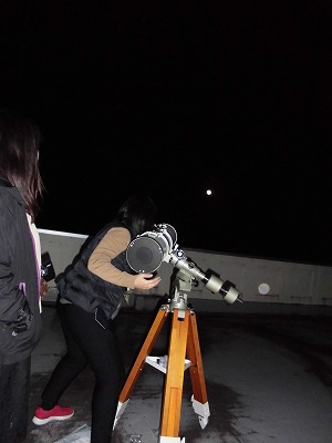 理科室の屋上から、満月を見上げます。 今日の所は、月愛好会の3名での お試し観察会です! 天体望遠鏡で月をとらえます。 この月は、私のカメラで撮ったものです。 望遠鏡越しに写る月のクレーターとかを紹介したかったのですが、私の年季物のカメラではうまくできませんでした。明晩、愛好会メンバーが増えますので、再度チャレンジします。必ず壮大なロマンをお届けします! |