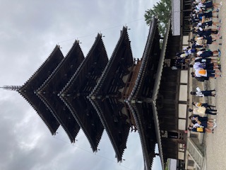世界最古の木造建築を前に、バスガイドさんの説明に耳を傾けながら、しっかりメモをとっている子どもたちでした。 バスに戻ると「おなかがすいたー」という声が!いつもより早い朝食だったのでなおさらでしょう。 次は、昼食会場のある奈良公園です。