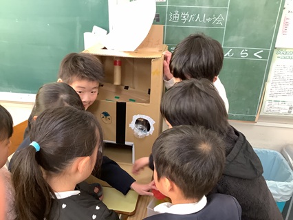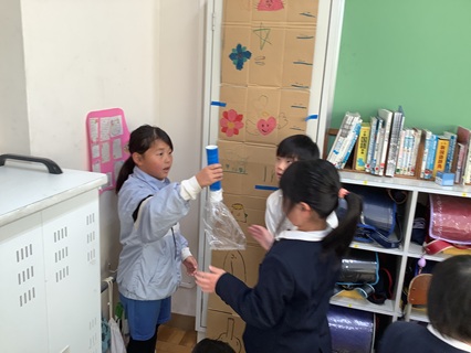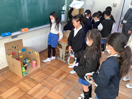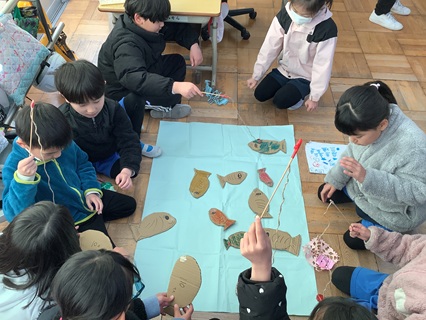 3月11日(水)2年生星組が1年生星組を招待しておもちゃランドで楽しみました。ガチャチャ、パタパタカー、紙コップロケット、UFOキャッチャー、ボーリング、魚つり、輪投げのコーナーがありました。子どもたちがどんなコーナーにするのか考え、協力して、おもちゃを作ったり、遊びの説明をしたり、景品を作ったりと、がんばったようです。1年生も楽しそうに遊んでいました。自分たちで考え、自分たちで準備し、自分たちで運営する、とてもいい経験です。この経験が、きっとこれからいろいろな場面で活かされることでしょう。楽しいおもちゃランドでした。