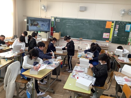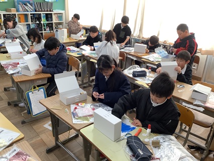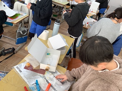 2月24日(火)3年生が図工で「のぞいてみると」という題材で工作をしていました。箱の中をのぞけるしかけを作り、その中にそれぞれが考えた世界をいろいろな材料を使って表現していました。「公園を作るの。」「海の中を作ってるよ。」と思い思いにいろいろな世界を作るようです。ワイヤー、セロハン、ビー玉、綿など、いろいろな素材を活かして制作していました。まだまだ作り始めたばかりです。どんな世界が完成するのか、楽しみで、「完成したら、のぞかしてね。」とお願いしてきました。