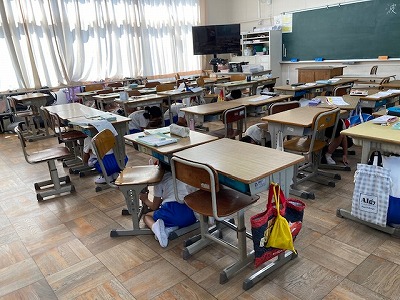 突然、「大きな地震が10秒後にやってきます」という放送が入りました。でも、子どもたちは大きな声を出すこともなく、机の下などにもぐることができました。