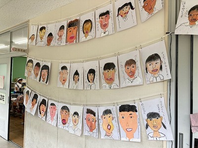 2年教室前のろうかに、子どもたちの自画像がずらりと並びました。
