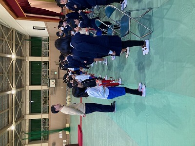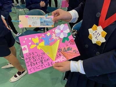 1年生はメダル、2年生はしおり、3年生はメッセージカードをプレゼントしました。お返しに6年生からは、卒業式で歌う「栄光の架け橋」を聞かせてもらいました。