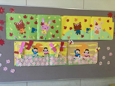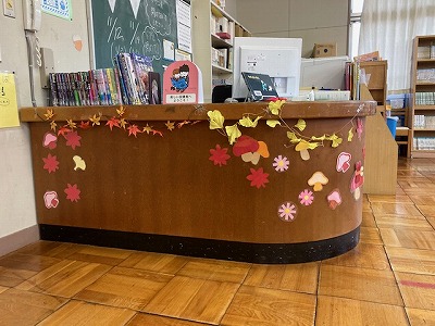 今日は、図書室前の掲示板と図書室内の掲示板、そして貸出カウンターを秋色に彩っていただきました。