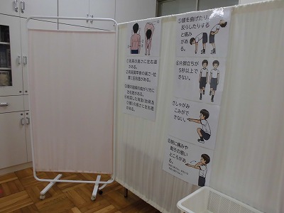 今日は、3・4年生の番です。 午前中いっぱいをかけて、校医の小渕先生に丁寧に診ていただきました。子どもたちの態度もとてもよかったです。 廊下で待つことも完璧! 終了後の保健室。こんな感じで受けています! 姿勢を診てもらう時のやり方がわかりやすく掲示してあります。先日の低学年は、教室で練習をしてから保健室に来たそうです。 約120人を診ていただいたのですが、小渕先生も看護師さんも、お疲れになったことと思います。養護教諭も気を張りっぱなしだったと思います。みなさん、本当にありがとうございます。 |