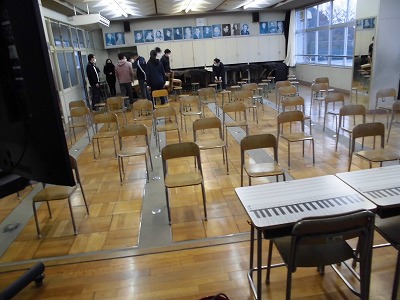 広い音楽室を講演会の会場とし、準備万端です! 最終打ち合わせ。 こころざしひとつに、明日も、みんなで頑張ろう! |