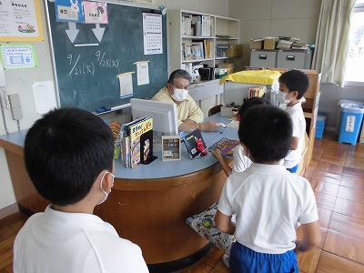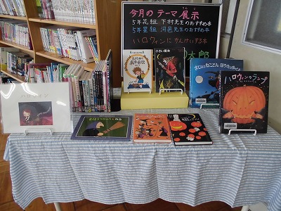 図書室の特設コーナーに、早くもハロウィンコーナーが登場しました。いるわ、いるわ、かぼちゃだらけ、魔女だらけ。こんなにたくさんの本があるんだと驚いていたら、「もっとたくさんあるんですが、セレクトしたんですよ」と司書さんの説明!
