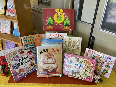 図書室に入ってすぐ右側には、「おもち」「十二支」「七福神」などお正月にちなんだ本がズラリと並んでいます。