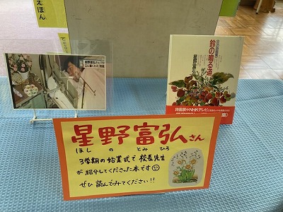 正面には、始業式で子どもたちにお話した星野富弘さんの本と星野さんが口に筆を加えながら絵を描いている写真が紹介されていました。始業式のZOOMではすべての作品を紹介することができませんでしたから、実際に本を手に取って一つ一つの作品をみてくださいね。