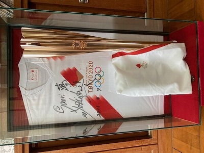 東京オリンピックのときの、聖火ランナーのユニフォームとそのトーチです。