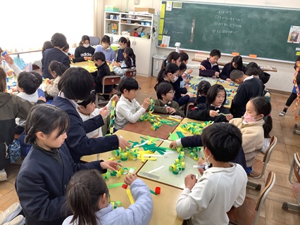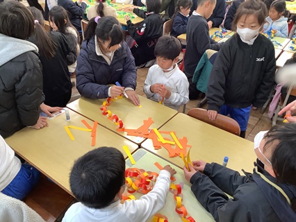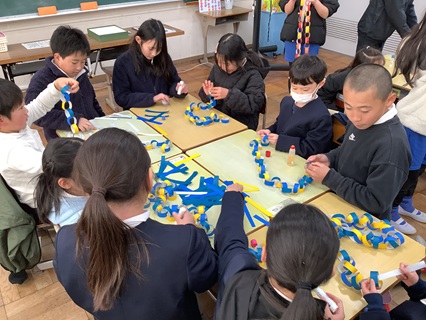 2月9日(月)1年生と5年生が一緒に輪かざり作りをがんばっていました。これは、6年生を送る会で使うものです。6年生は、いよいよもうすぐ卒業となります。これまでの感謝をこめて、すてきな思い出に残る6年生を送る会にしようと、5年生が企画運営します。いつも1年生を助けてくれたのは、6年生でしたが、そういうわけで、今日は、5年生が助けてくれます。1年生にやさしくあたたかい関わりでお助けしてくれる5年生が、とても頼もしく見えました。みんなで力を合わせ、すてきなきれいな輪かざりがどんどん作られていきました。